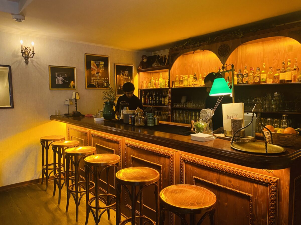 Karloff Topağacı, antika mobilyalar ve aksesuarlarla dekore edilmiş, loş ve samimi atmosferiyle misafirlerine benzersiz bir deneyim sunmaktadır. Girişinde tabela bulunmayan mekân, özellikle mahalle sakinleri ve bölgeyi sevenler tarafından kısa sürede keşfedilmiştir. Kokteyllerin odak noktada olduğu barda, çay ocağı temalı viski shot sunumları gibi özgün detaylar dikkat çekmektedir. Klasik kokteyllerin uyarlamaları arasında Whiskey Sour ve Negroni twistleri öne çıkmaktadır. Ayrıca, viski çeşitleri ve sınırlı sayıda bira da menüde yer almaktadır.
